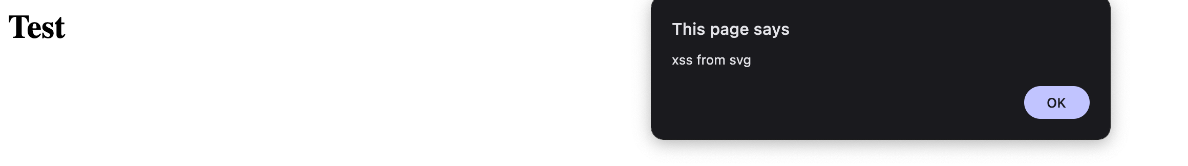 # Trusting file extension @app.route("/profile/<user_id>") def profile(user_id): svg = open(f"uploads/{user_id}.svg").read() return f"<div class='avatar'>{svg}</div>" # The attacker uploads a file containing <svg xmlns="http://www.w3.org/2000/svg" width="100" height="100"> <[script]>alert('xss from svg')<[/script]> </svg>